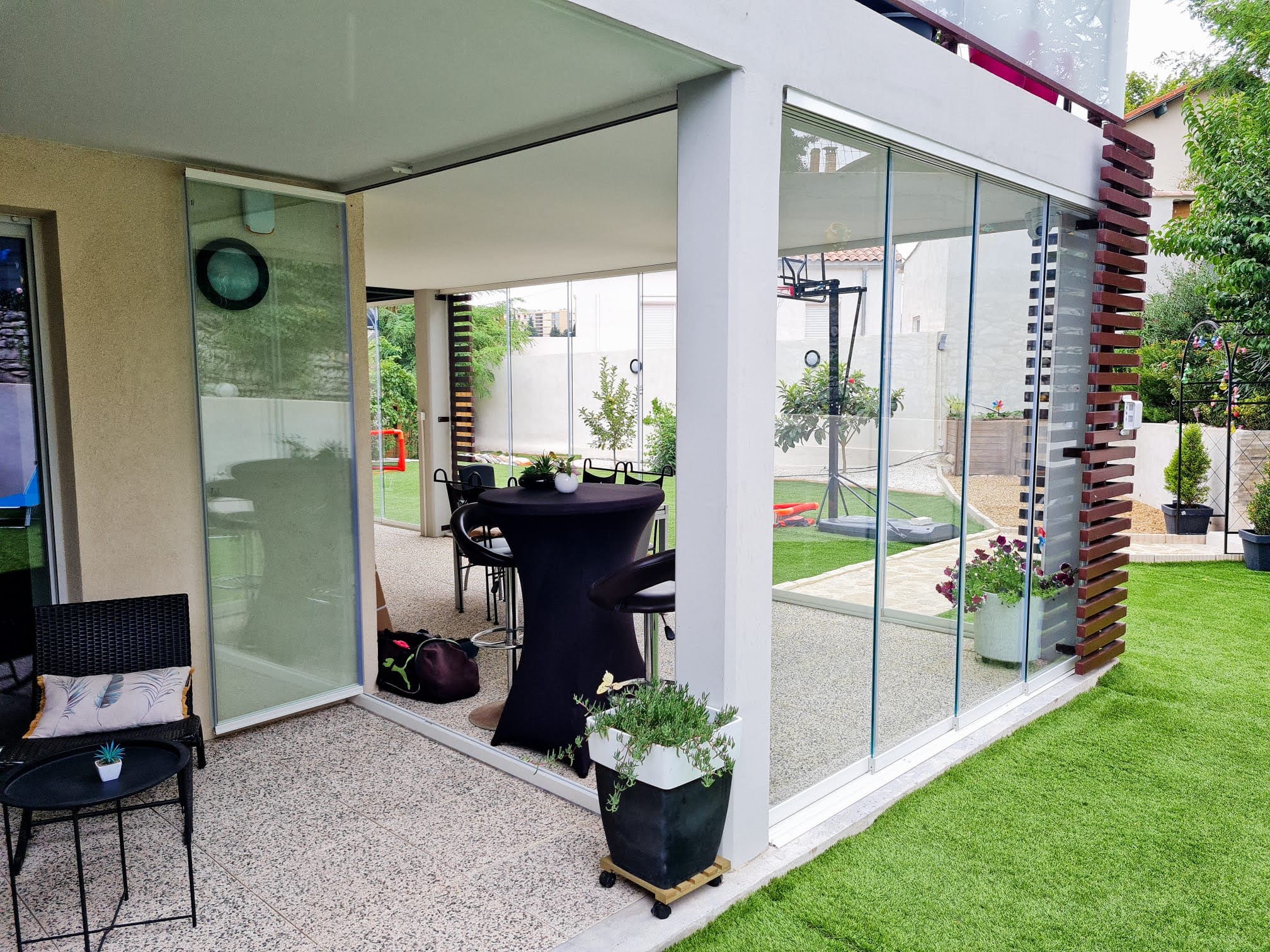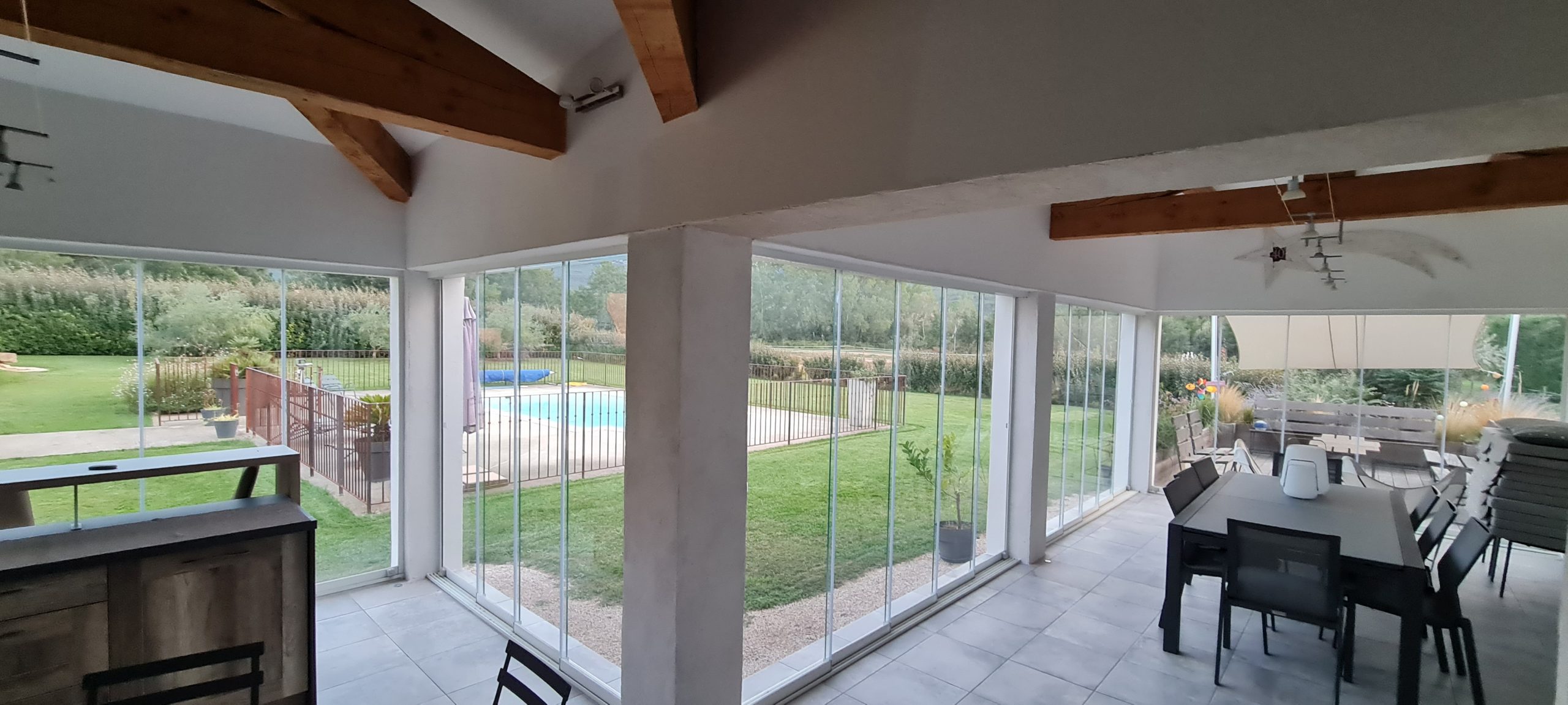 Les verres coulissants ne disposent pas de profils verticaux et sont très recommandés pour l’ industrie de l’hôtellerie contre le vent et la poussière, tout en préservant la luminosité toute en conservant une vue panoramique. Le système se compose de 3 ou 4 voies et permet l’empilage de tous les panneaux sur un côté, en laissant un espace ouvert.
